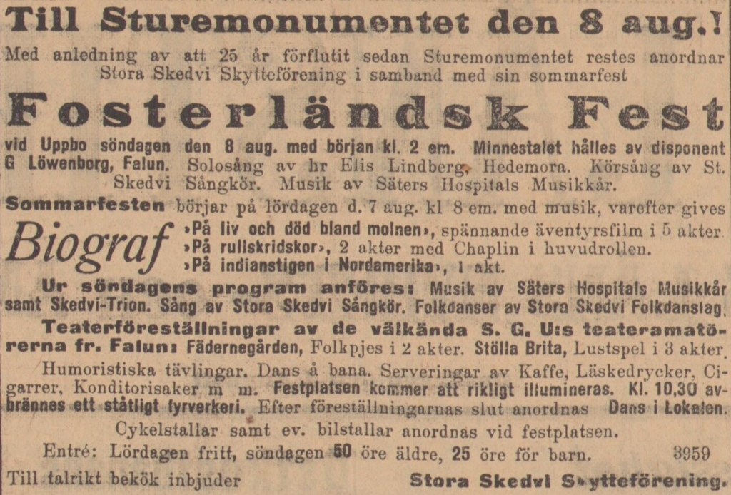 Programmet innehåller fältgudstjänst med pastor Axel Hansson och en orkester, uppträdanden av Dalregementets musikkår, Stora Skedvi folkdanslag, spelmän samt uppläsningar. Som en storslagen final blir det lekar för ungdomarna när mörkret faller och festplatsen lyses upp av marschaller samt hundratals glödlampor i träden. Man förstår att många ser fram emot festdagen! Det vankas också stora födelsedagshyllningar till tre lokalinvånare som fyller 50 och 60 år, så sommaren 1926 verkar bli festlig och idyllisk.