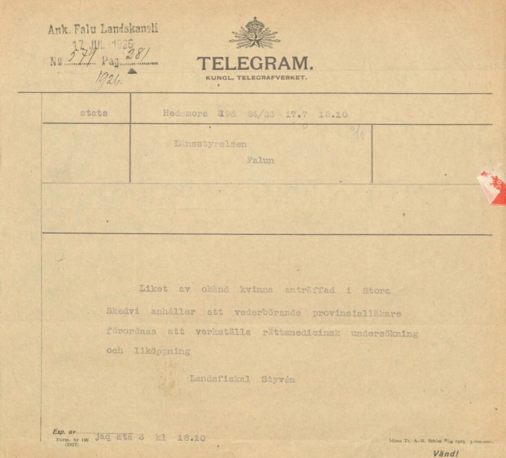 Liket förs till bårhuset vid Stora Skedvi kyrkogård för obduktion, nu har myndigheterna fått ett mysterium på halsen. Men ganska snart tror sig landsfiskal Styvén ha löst gåtan med kvinnans identitet, hon ska vara Elsa Maria Svensson från Laxarby socken i Dalsland.