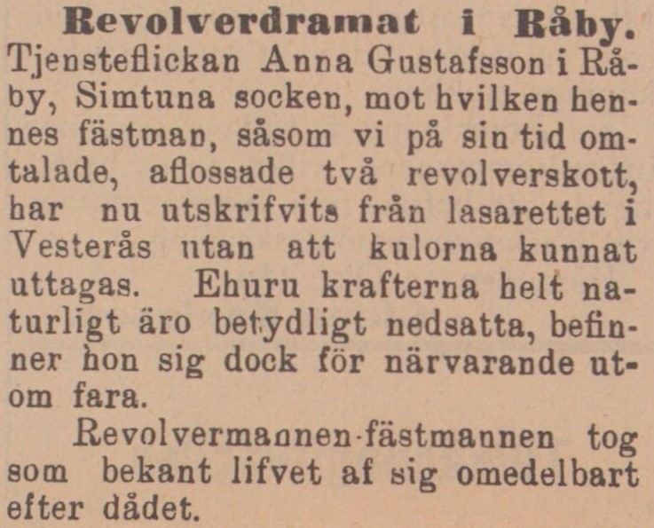 Paret får flera barn tillsammans, men Anna lever på lånad tid och dör endast 43 år gammal den 14 oktober 1916 i astma och vattusot. Alltså en sjuklig ansamling av vätska i kroppen, eller ödem kallat. Så kanske lyckas Gustaf åtminstone på sikt förkorta Annas liv med revolverskotten 1894. Hennes make gifter om sig året därpå och avlider först 1939.