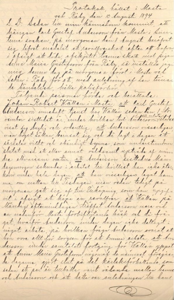 Måndagen den 6 augusti 1894 dyker Gustaf inte upp till sina sysslor, vilket noteras av husbonde Wallén som undrar var hans dräng har tagit vägen. De två råkar dock på varandra under måndagseftermiddagen vid en bäck nära gården, där bonden frågar sin dräng varför han varit frånvarande under dagen. Gustaf berättar då att han är alltför sorgsen för att kunna arbeta efter att Anna gjort slut med honom.