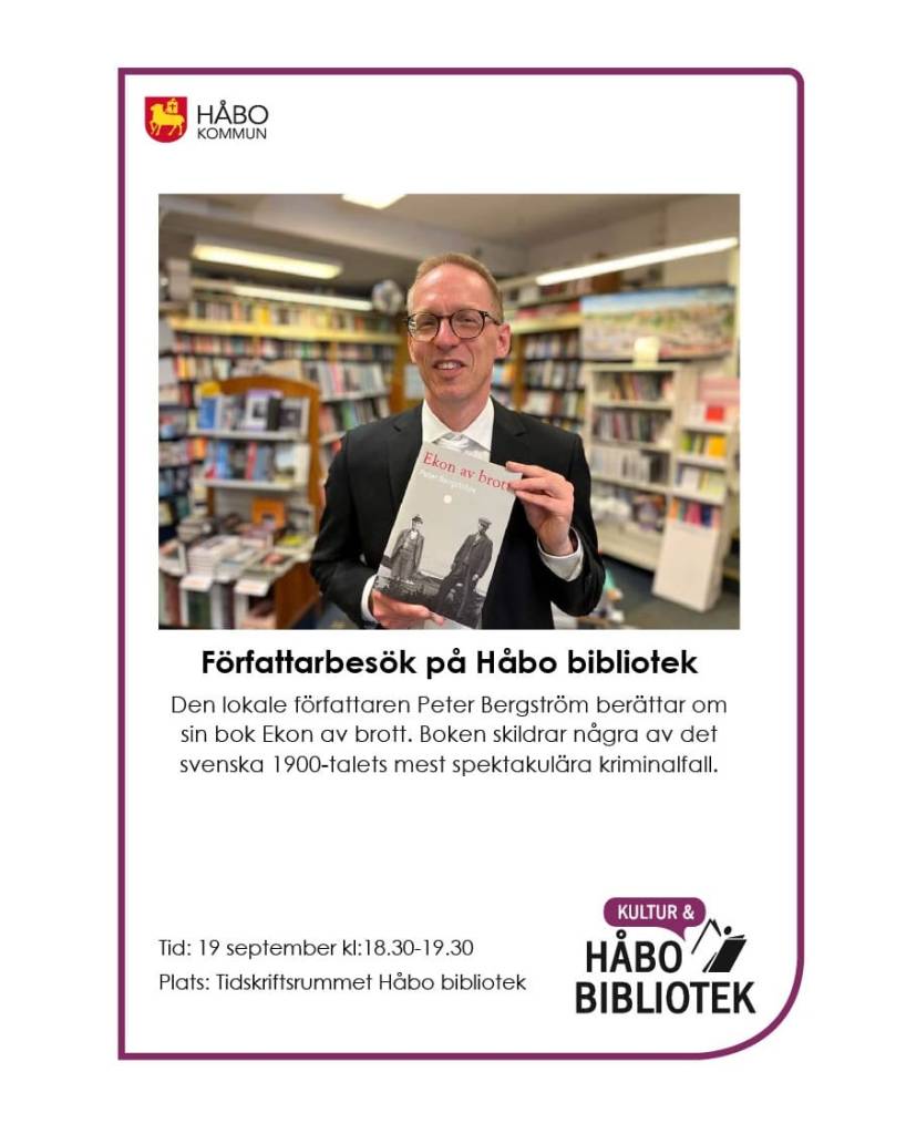 19 september 2023 kl. 18.30-19.30, föreläsning på Håbo bibliotek om min bok Ekon av brott. Försäljning och signering av boken efteråt.