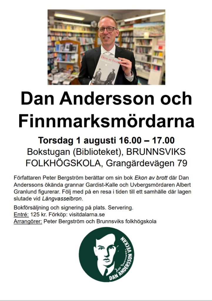 1 augusti 2024 kl. 16-17 Dan Andersson och finnmarksmördarna, föredrag i Brunnsviks folkhögskolas bokstuga under Dan Andersson-veckan. Inträde 125:-, biljetter kan köpas via länken ovan eller i entrén om det inte är slutsålt. Försäljning och signering av böcker efteråt. Varmt välkomna!