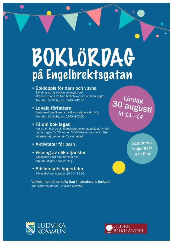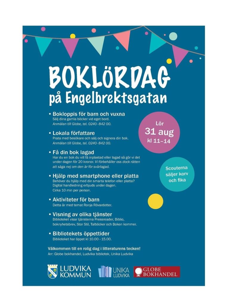 31 augusti 2024 kommer jag att sälja och signera böcker på Boklördag i Ludvika, varmt välkomna dit!