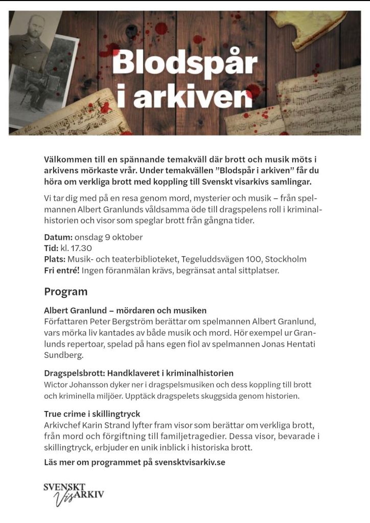 9 oktober 2024 klockan 17.30 kommer jag att hålla ett föredrag på Musik- och teaterbiblioteket om mördaren och spelmannen Albert Granlund. Dessutom framför spelmannen Jonas Hentai Sundberg exempel ur Granlunds egen repertoar från noter i Svenskt visarkivs ägo. På mördarens egen fiol. Och så pratar Wictor Johansson om ”Dragspelsbrott: Handklaveret i kriminalhistorien” och Karin Strand om ”True crime i skillingtryck”. Det här vill ni inte missa! Läs mer här.