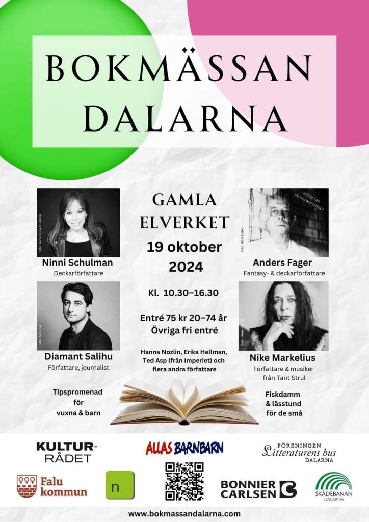 19 oktober 2024. Kom och besök mig på Dalarnas Bokmässa i Falun där det blir försäljning och signering av mina böcker. Mässan hittar ni på Ölandsgatan 8 i Gamla Elverket. Jag finns där mellan 10.30 och 16.30, varmt välkomna!