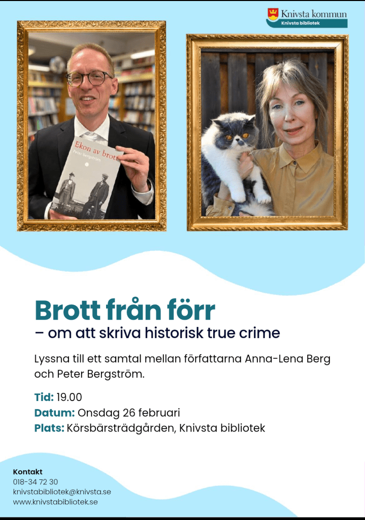 26 februari 2025 klockan 19 blir det ett författarsamtal mellan mig och kollegan Anna-Lena Berg på Knivsta bibliotek om att skriva True crime. Varmt välkomna!