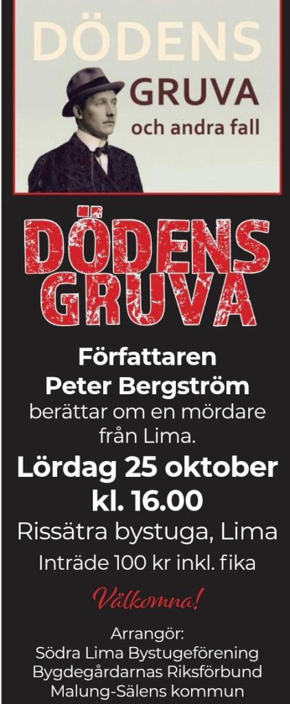 25 oktober 2025. Klockan 16 kommer jag att hålla ett föredrag om min senaste bok Dödens gruva och andra fall. Plats? Risätra bystuga i Lima, hoppas vi ses där! Böcker finns till försäljning och signering efteråt, givetvis till förmånliga priser.