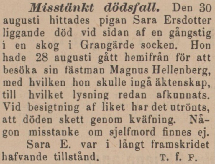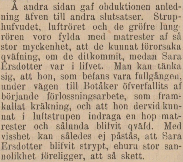 Onsdagen den 30 augusti 1882 hittas nämligen den mystiskt frånvarande Sara vid en stig i skogen mellan Botåker och Botgärde, hon är inte längre försvunnen men dessvärre också död. Och dödsfallet är misstänkt, starkt misstänkt. Saras ansikte är mörkblått och uppsvällt, tungan nästan svart, i ögonen har blodkärl spruckit och blodet runnit ut över halsen och bröstet. Mossan, där Saras huvud kommit att vila, är genomdränkt av hennes blod. På vänstra sidan av halsen och högra kinden ser man svartblå fläckar.