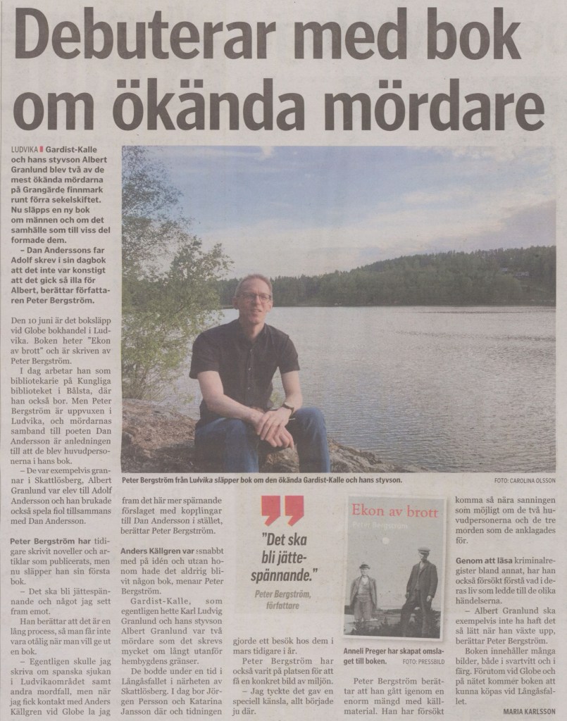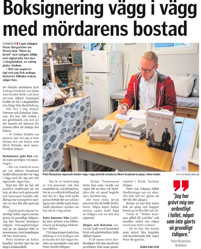 4 juni 2023. Om mindre än en vecka släpps min debutbok Ekon av brott, och tidningen Lokalt i Dalarna har skrivit en liten artikel om det hägrande släppet.