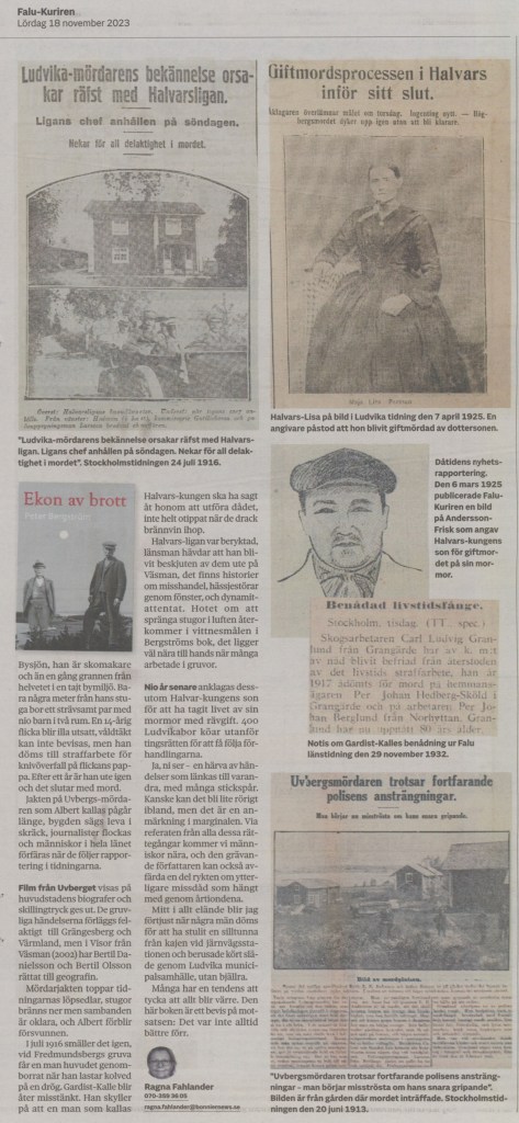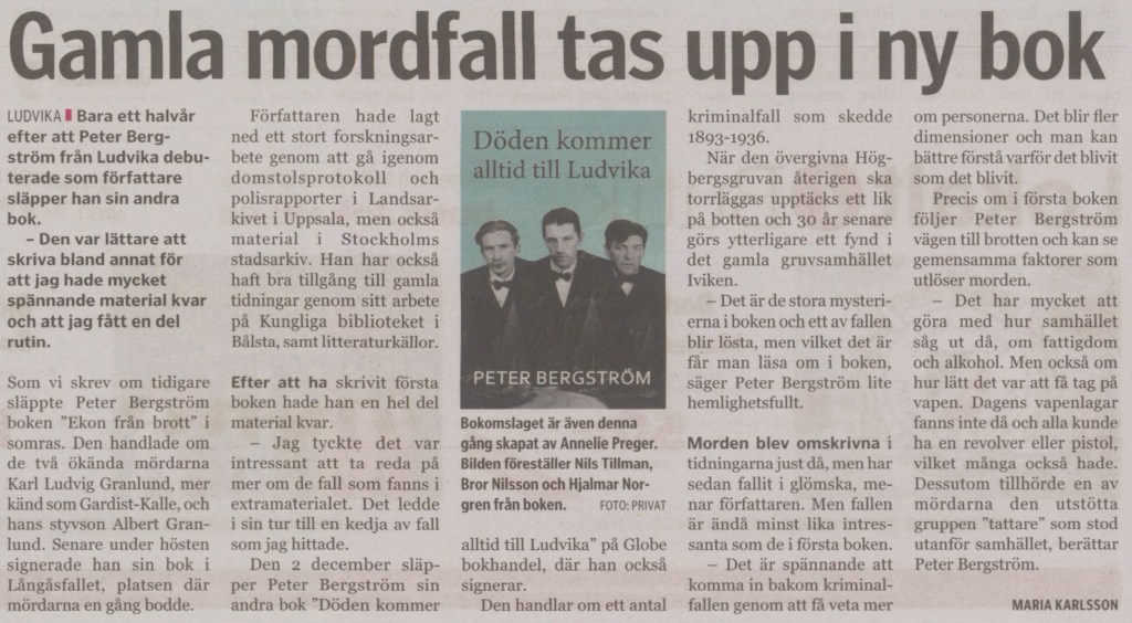 7 december 2023. En väldigt trevlig artikel om min nya bok Döden kommer alltid till Ludvika finns i dagens upplaga av Nya Ludvika Tidning.