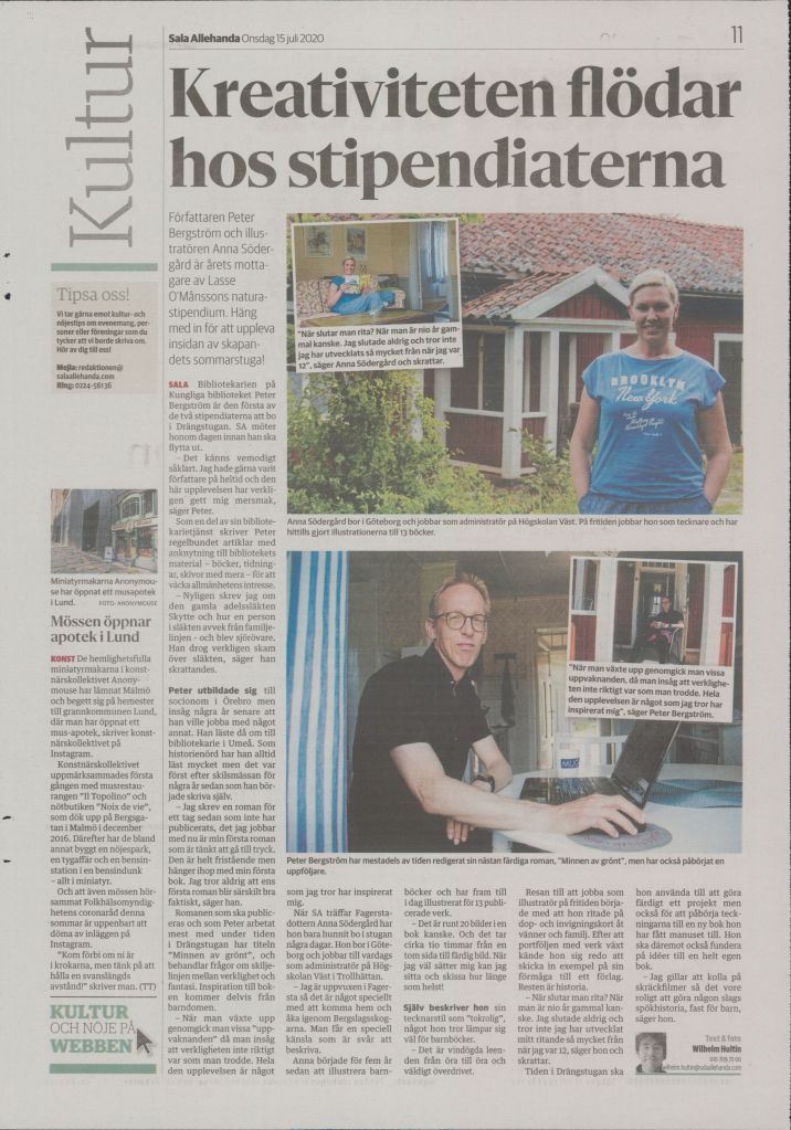 15 juli 2020. Jag fick Lasse O´Månssons naturastipendium och kunde sitta i Drängstugan vid Sala silvergruva under hela juni månad för att bara skriva. Tack för den underbara vistelsen Sala kommun, den blev ett minne för livet och en mycket produktiv månad!