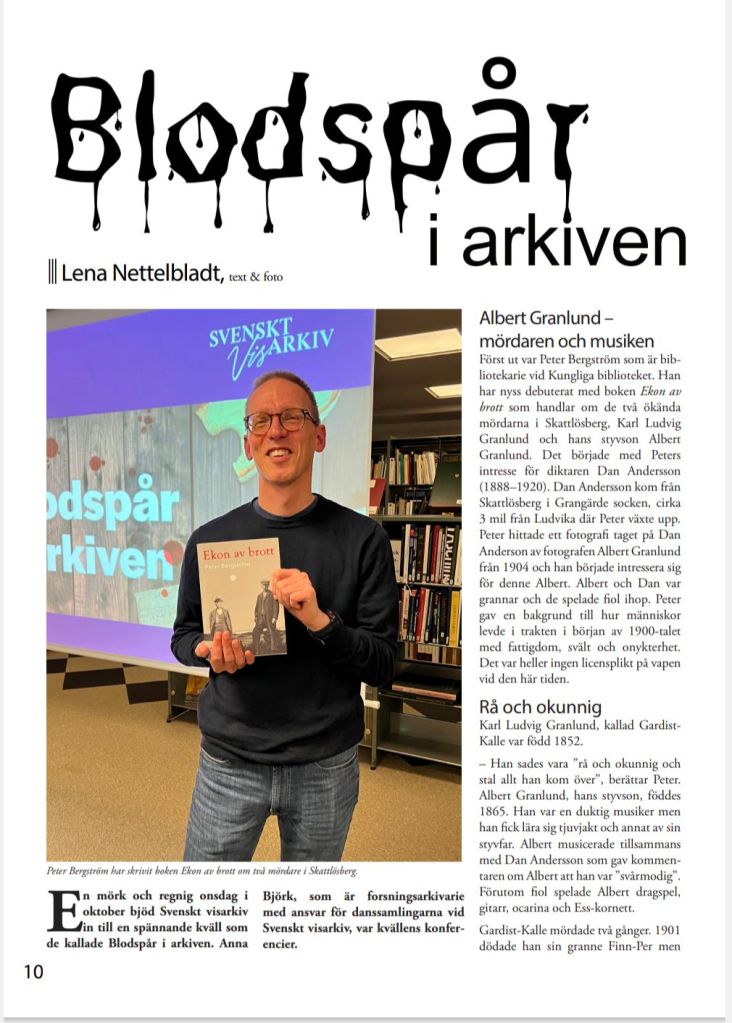 15 november 2024. I senaste numret av På färdvägarna finns det nu en artikel av mig som handlar om Uvbergsmördaren Albert Granlunds fiol.