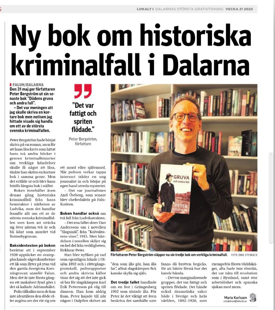 16 maj 2025. I senaste Lokalt i Dalarna finns en artikel om mig och den kommande boken Dödens gruva och andra fall.