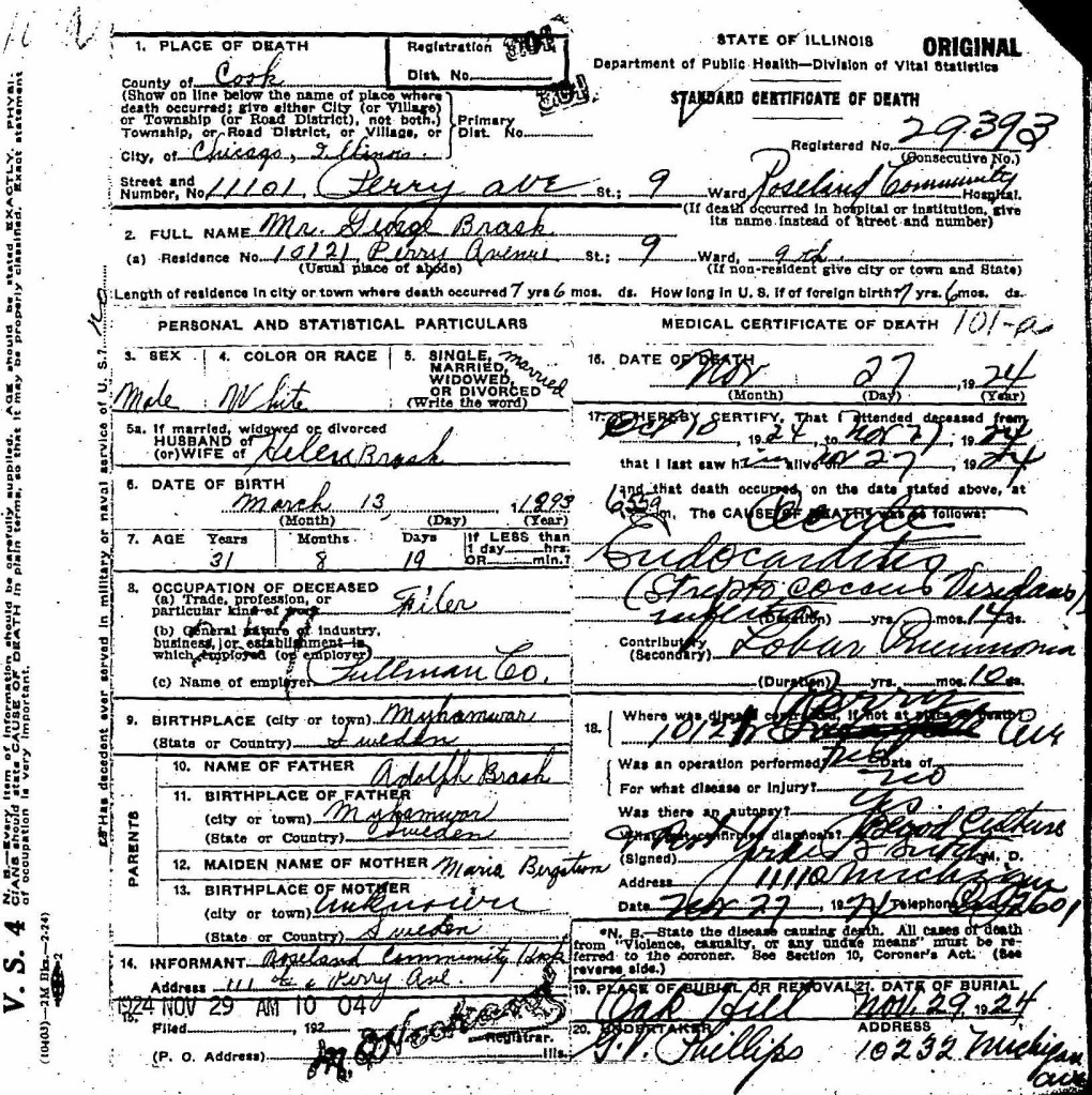 För det visar sig att tidigare skribenter missat en viktig detalj när det gäller Georg – han kallar sig då George – Brasks öden i Amerika. Han dör nämligen i Chicago den 27 november 1924, endast 31 år gammal, och begravs två dagar senare. Paret får inga barn förutom Herbert. Ryktet om ett erkännande på just 1940-talet kommer med stor sannolikhet från det faktum att mordet preskriberas 1940, efter det behöver mördaren inte längre frukta den jordiska rättvisan.
