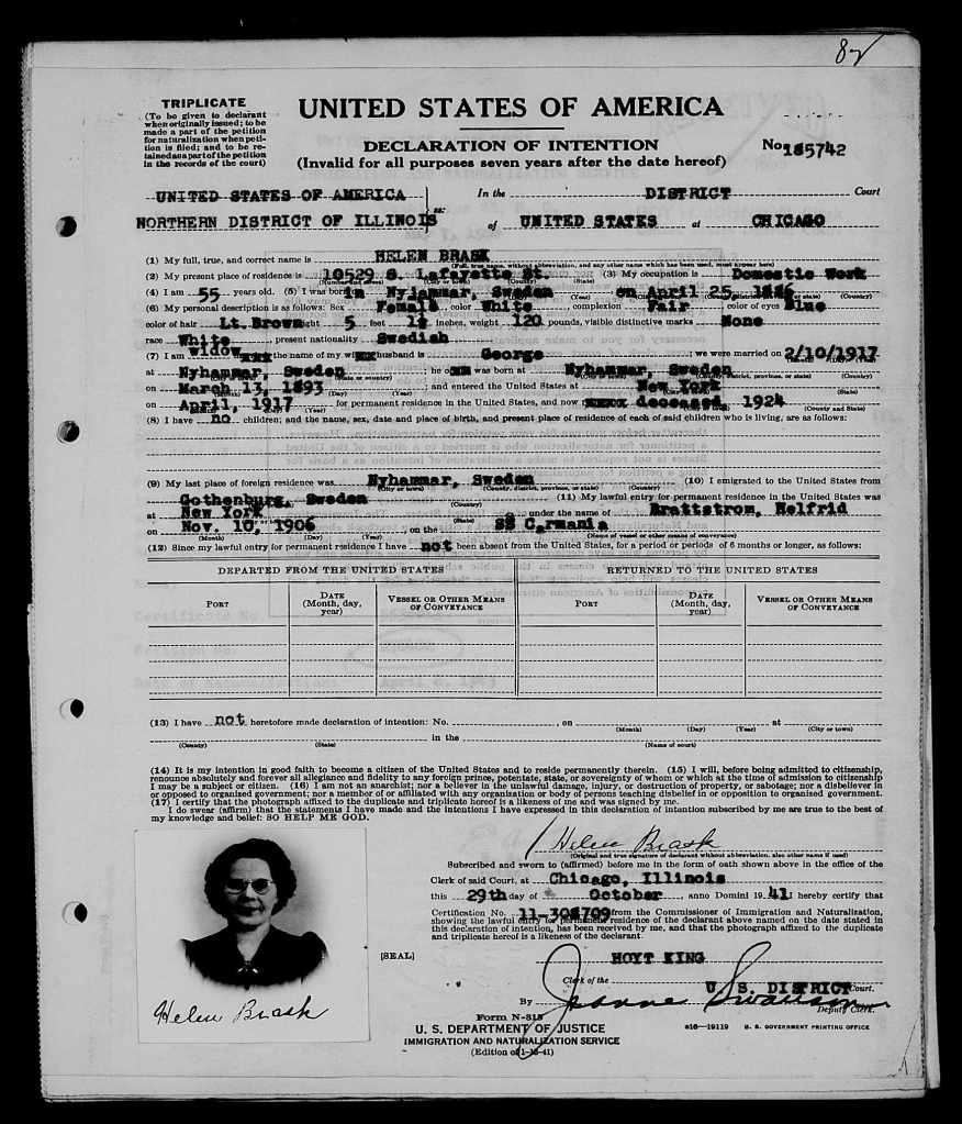 Helfrid – som nu kallar sig Helen Brask – stannar kvar i staden och dyker upp igen i samband med en tragisk händelse. Det är när sonen Herbert insjuknar och avlider den 30 juli 1934 bara 16 år gammal, så nu är Helfrid alldeles ensam i världen igen. På ett dokument från den 29 oktober 1941 dyker hon upp på nytt i en ansökan för att bli naturaliserad amerikansk medborgare. Snart ska hon också slippa vara ensam, för i augusti 1942 gifter sig Helfrid med den nio år äldre Johan Wahlberg från Svärdsjö. Paret dyker upp en sista gång i officiella amerikanska dokument 1943 när ytterligare en ansökan om naturalisering görs. Efter det är deras öden på andra sidan Atlanten okända.